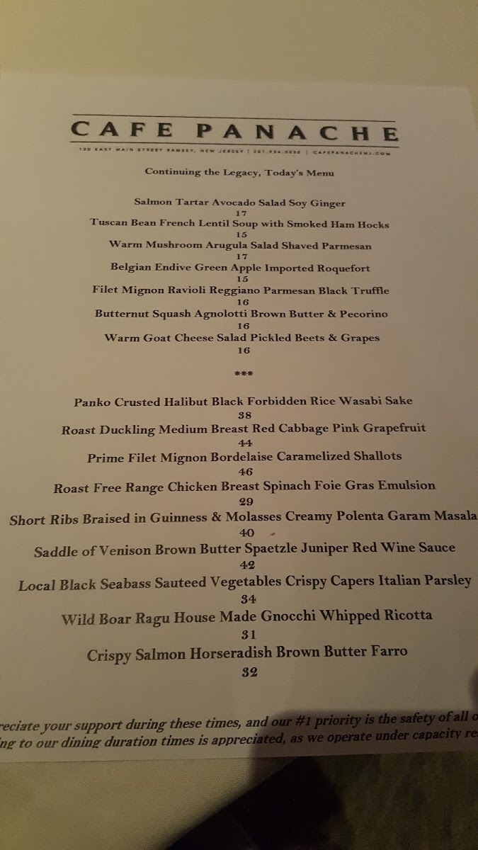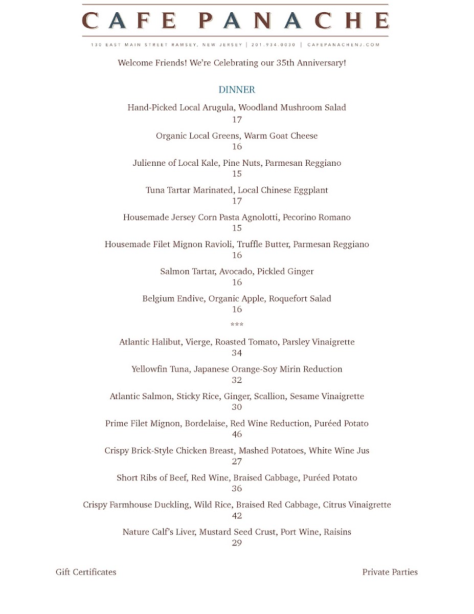 Café Panache, located at 130 E Main St, Ramsey, NJ, has been delighting diners for 25 years with its exquisite culinary offerings. Renowned for its exceptional filet mignon and crispy duck, this charming restaurant captures the essence of fine dining while maintaining a welcoming atmosphere. With an experienced and friendly staff dedicated to providing personalized service, Café Panache is ideal for both intimate dinners and grand celebrations. The BYOB policy adds value without compromising quality, making every visit memorable. Guests appreciate the attention to detail, from beautifully presented dishes to accommodating dietary preferences, creating a truly delightful dining experience.